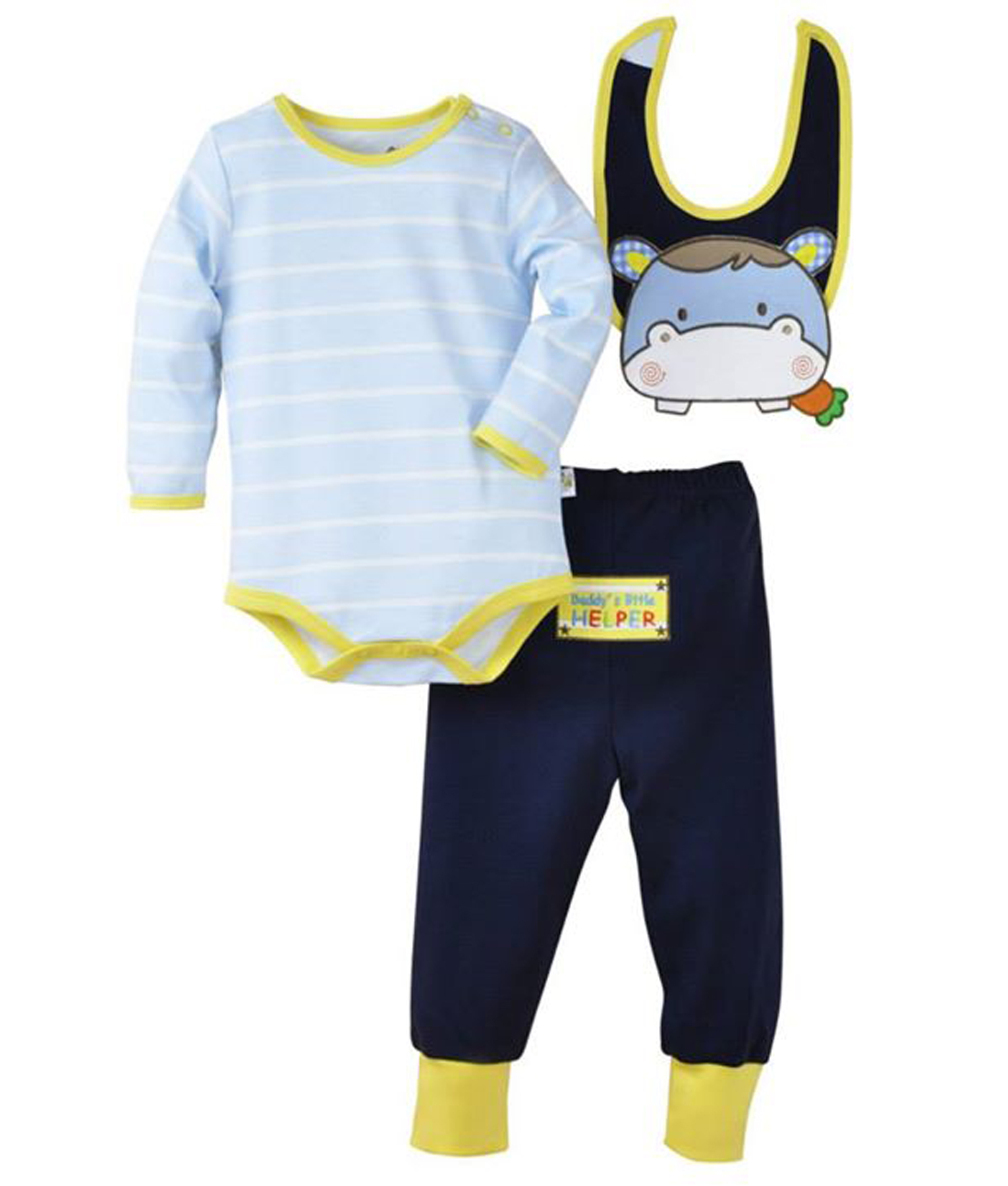Setelan bodysuit, celana anak dan bib dengan bahan cotton yang nyaman untuk bermain di rumah dan tetap stylish untuk bepergian. Bodysuit lengan panjang biru muda garis-garis, celana biru tua dengan lining warna lime, bib dengan aplikasi sapi yang sedang makan wortel. Standard cutting.