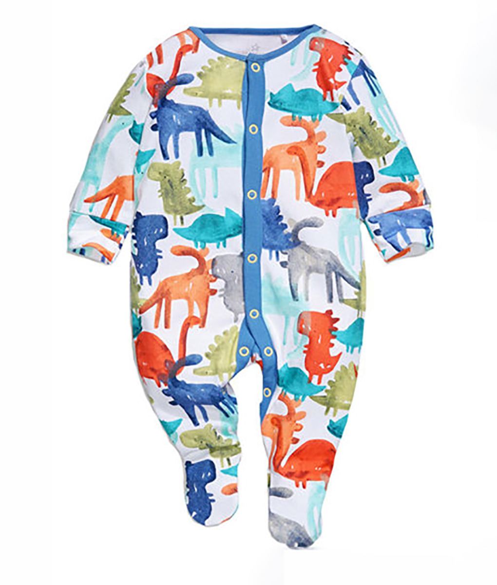Sleepsuit warna putih dengan motif dinosaurus warna-warni. Berkancing depan, sehingga mudah dan nyaman saat dikenakan oleh si kecil. Standard cutting.