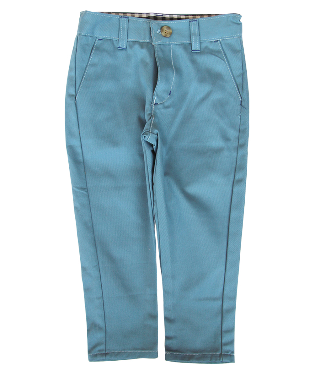Celana anak warna kebiruan dengan kantong dan tempat ikat pinggang.