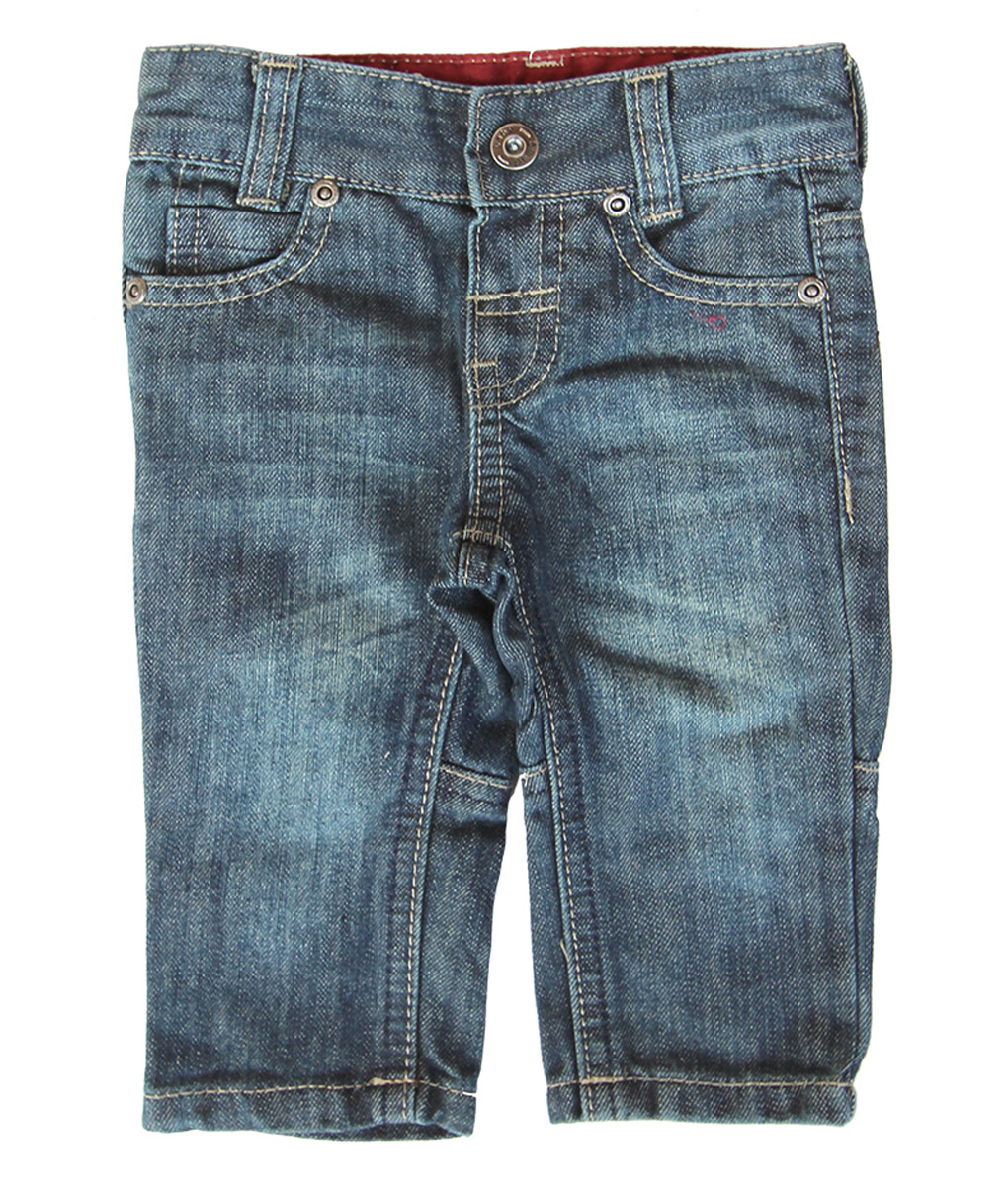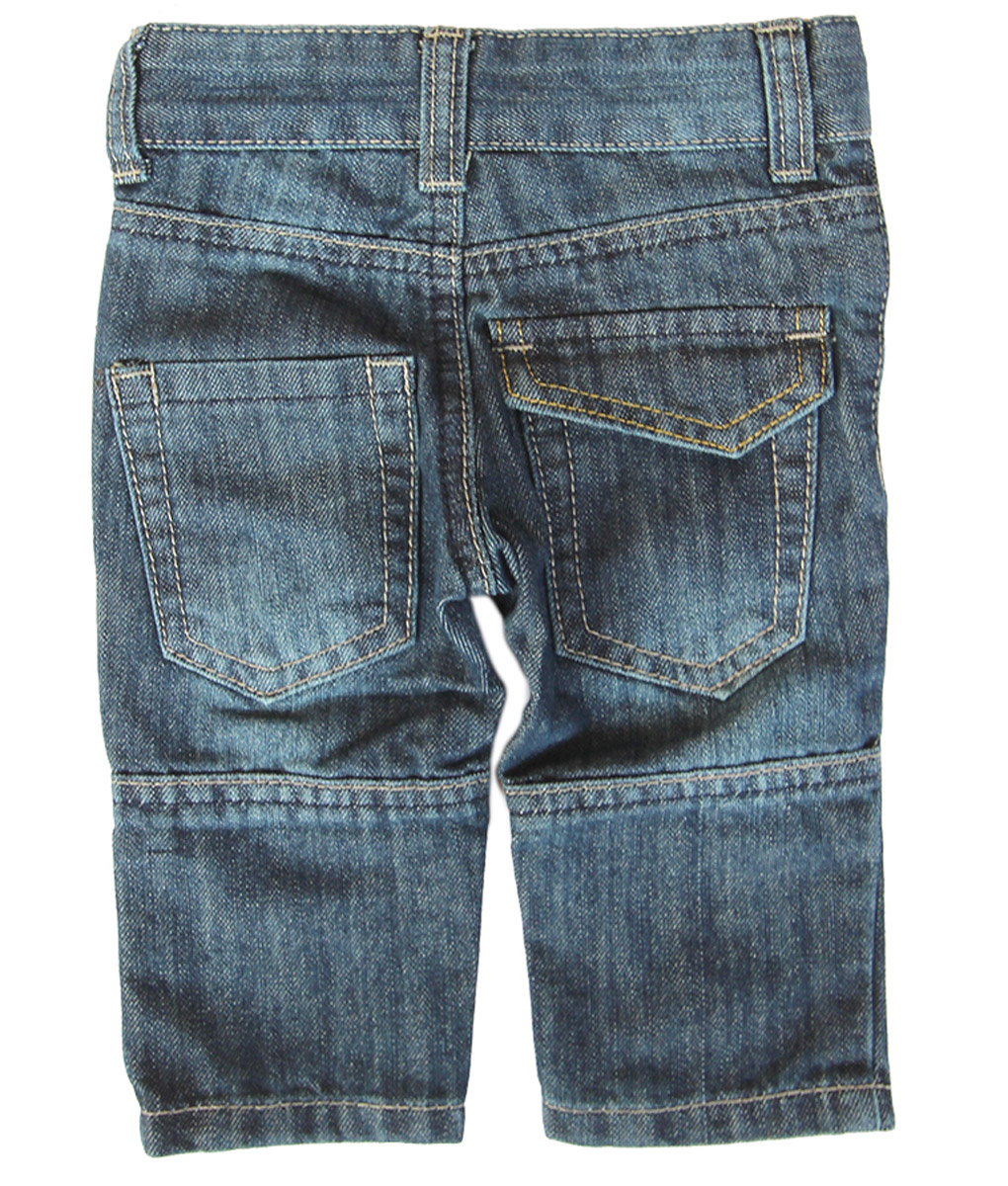 Jeans bayi dengan model celana kargo yang dilengkapi dengan aksen lining jahit di bagian belakang lutut, memiliki kantong depan dan kantong belakang serta tempat ikat pinggang. Standard cutting.