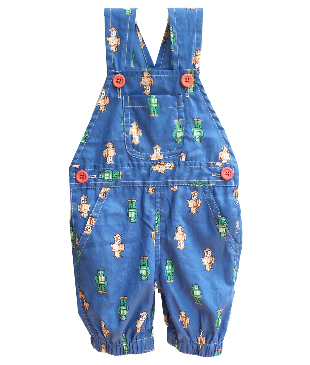 Overall biru model celana panjang dengan motif robot. Bahannya lembut dan nyaman dikenakan si kecil dalam kegiatan sehari-harinya karena terbuat dari katun. Terdapat aksen kancing pada bagian kiri kanan pinggang. Standard cutting.