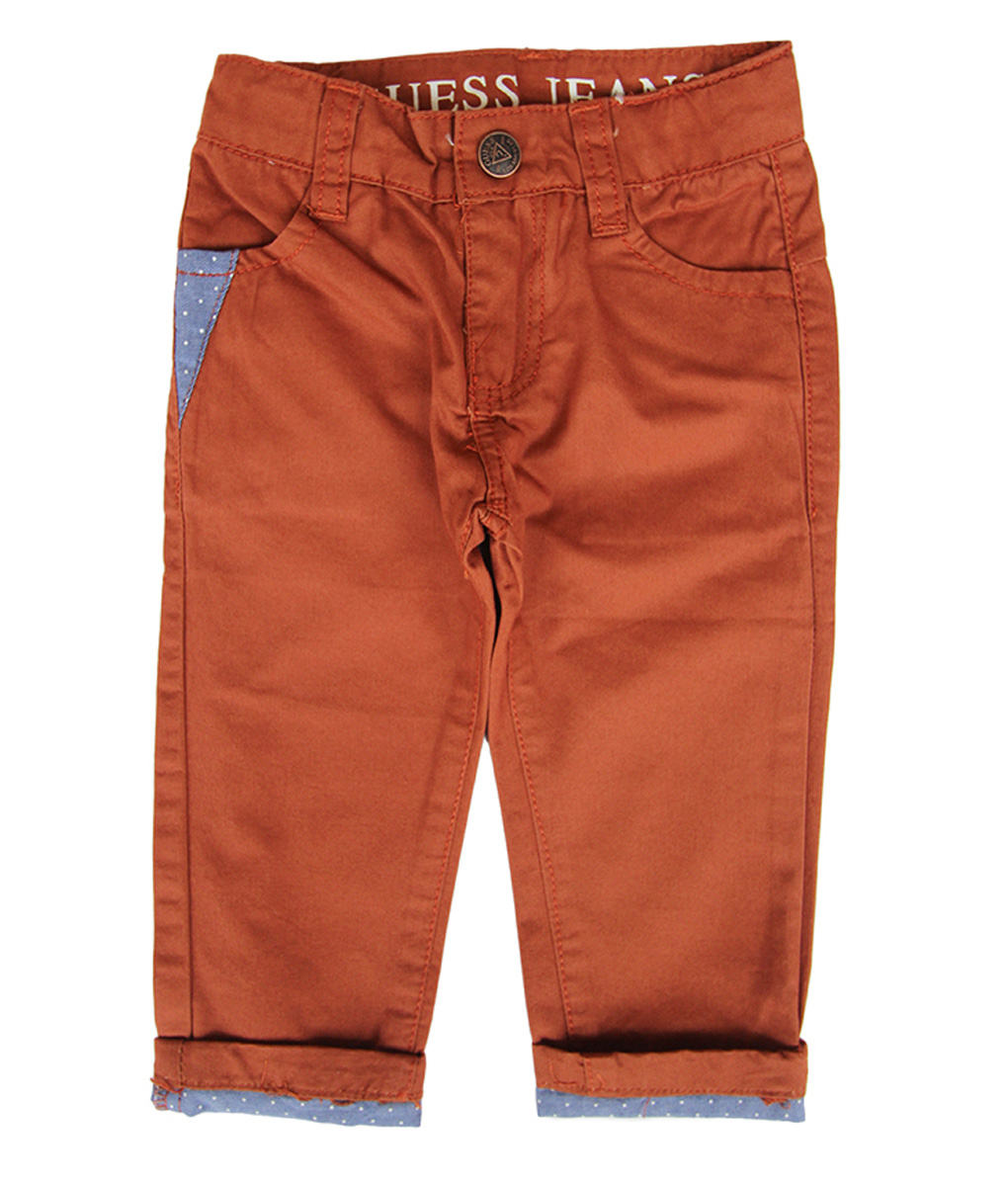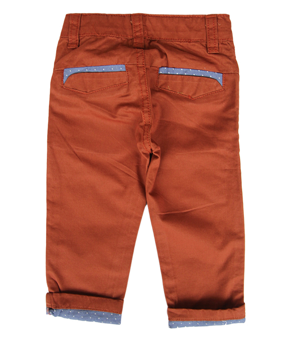 Celana bayi warna coklat dengan lining polkadot warna biru pada kantong depan, kantong belakang, dan aksen lipat di bagian bawah celana. Standard cutting.