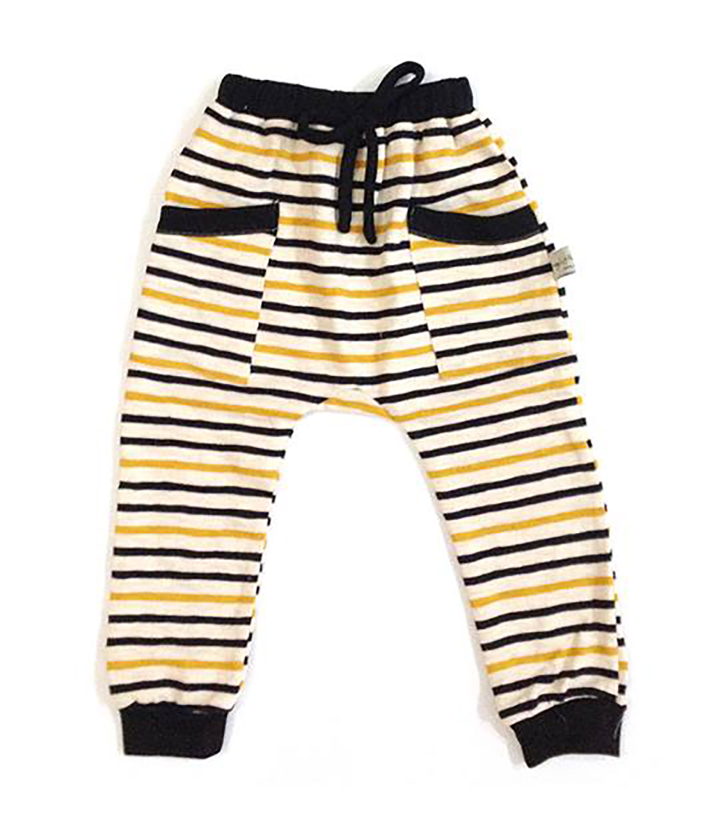 Jogger pant untuk bayi dan todler, dengan motif stripes warna kuning dan hitam, beraksen hitam pada bagian lining pinggang, garis atas kantong dan pergelangan kaki. Pinggang karet bertali sehingga mudah serta nyaman dikenakan oleh si kecil. Standard cutting.