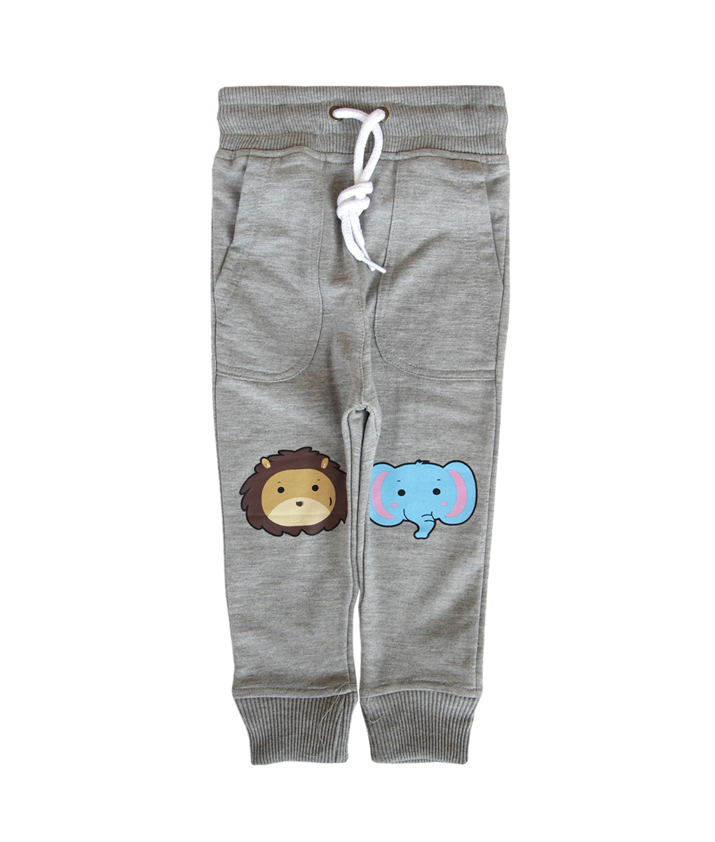 Celana jogger panjang warna grey dengan pingang karet bertali yang bisa menyesuaikan pinggang anak. Terdapat kantong pada sisi kanan dan kiri. Juga terdapat patch bergambar singa dan gajah pada bagian lutut. Standard cutting.
