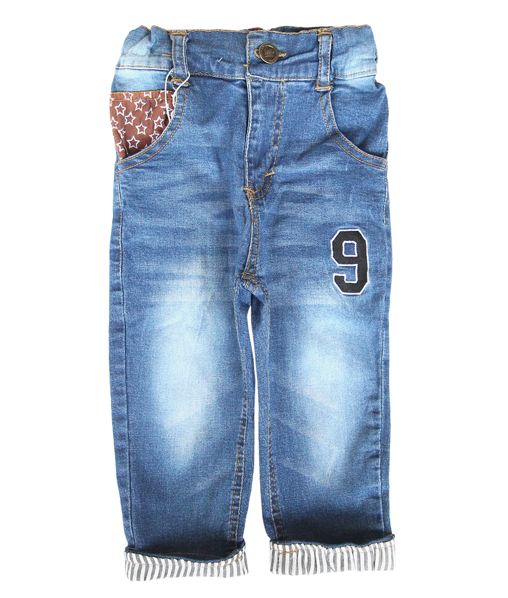 Celana jeans untuk anak usia 1-6 tahun, dengan aksen kantong motif, serta aplikasi bordir angka sembilan pada sebelah kiri celana dan bagian bawah kaki digulung dengan motif garis-garis. Standard cutting.