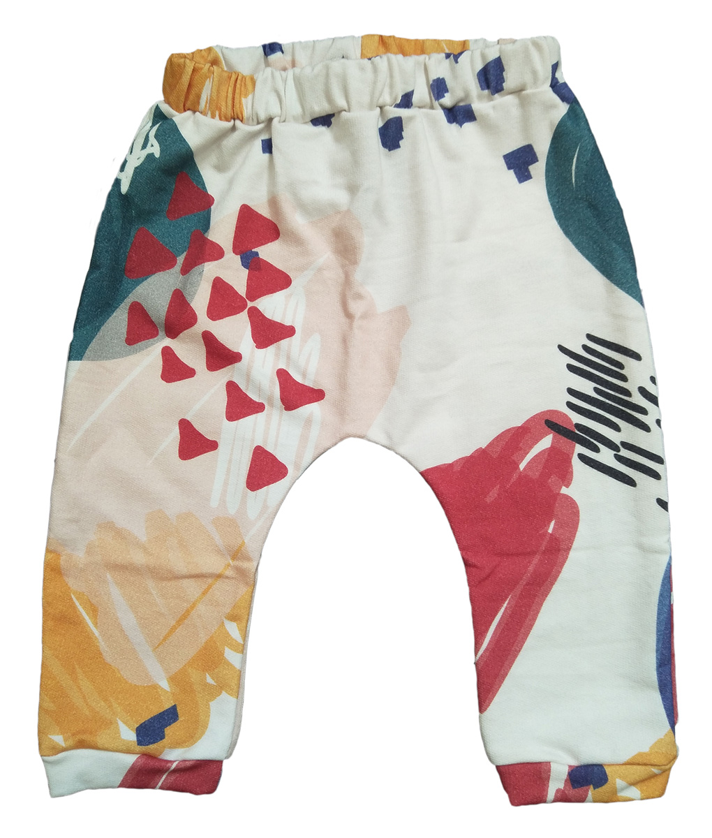 Celana dengan model harem warna putih dengan motif awan abstrak. Berpinggang karet sehingga mudah dikenakan. Yang berbeda dari produk ini adalah bahannya menggunakan Baby Terry 100% organik, dengan printing tinta yang juga aman untuk bayi. Standard cutting.