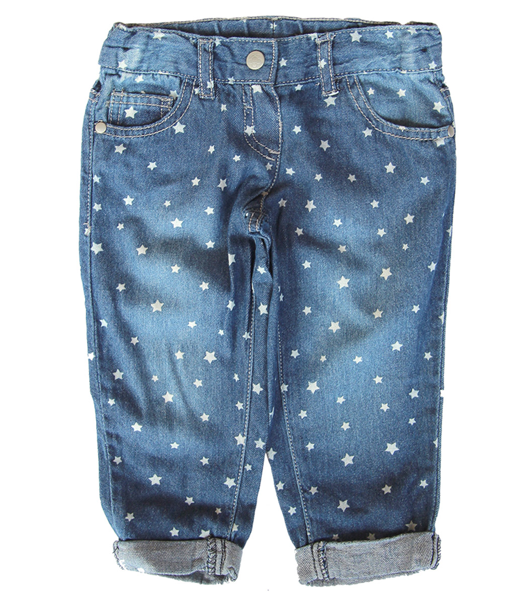 Celana jeans biru dengan motif bintang, aksen lipat di bagian bawah celana, disertai kantong depan, kantong belakang, dan tempat ikat pinggang. Standar cutting.