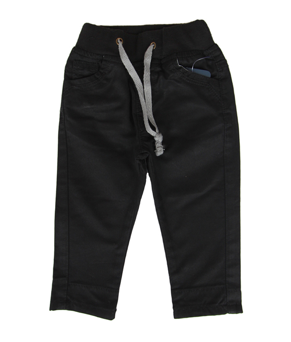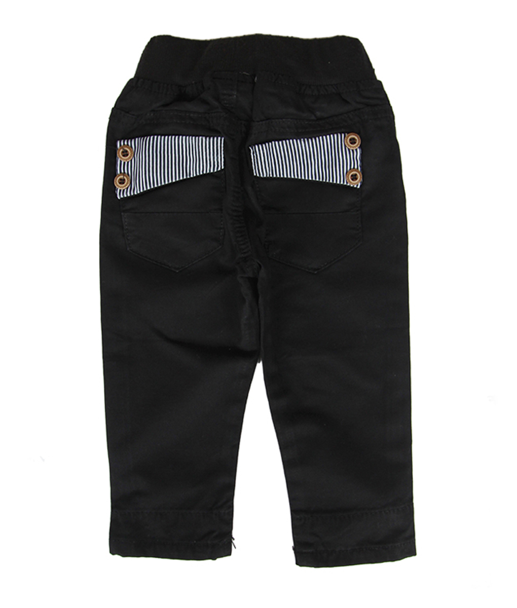Celana anak warna hitam dengan aksen garis pada kantong belakang dan lipatan celana bagian bawah, pinggang dapat disesuaikan dengan tali pinggang, dilengkapi kantong. Standard cutting.