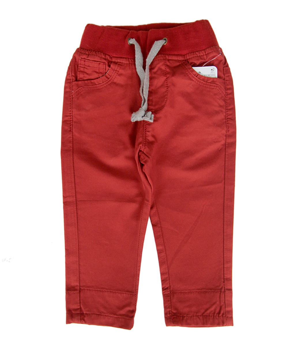 Celana anak warna merah dengan aksen garis pada kantong belakang dan lipatan celana bagian bawah, pinggang dapat disesuaikan dengan tali pinggang, dilengkapi kantong. Standard cutting.