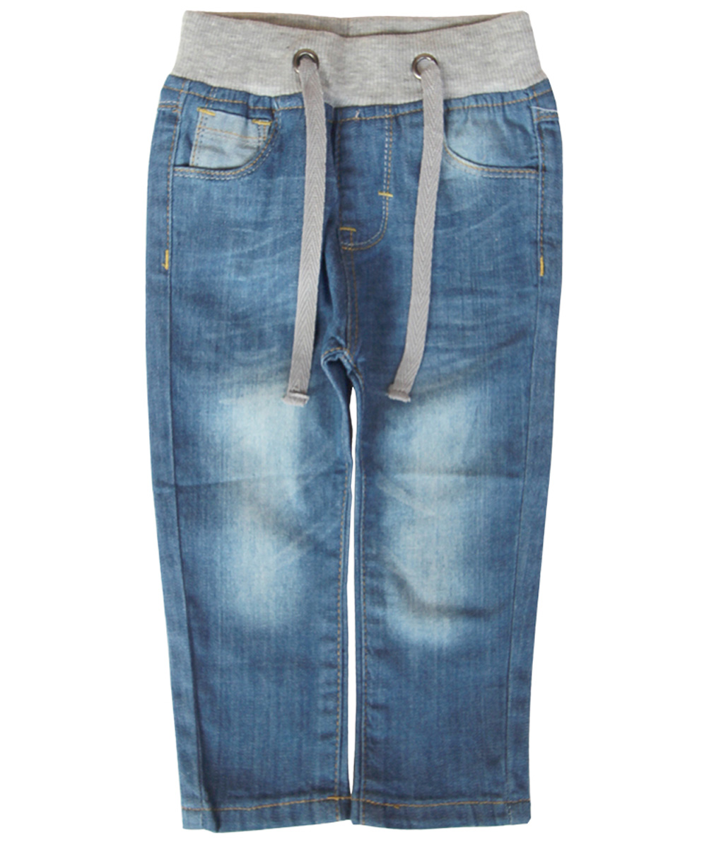 Jeans bayi size 6-24 bulan, warna biru dengan garis pinggang elastis warna abu-abu dilengkapi tali, dengan aksen washed pudah di bagian paha dan aksen tambalan kantong.