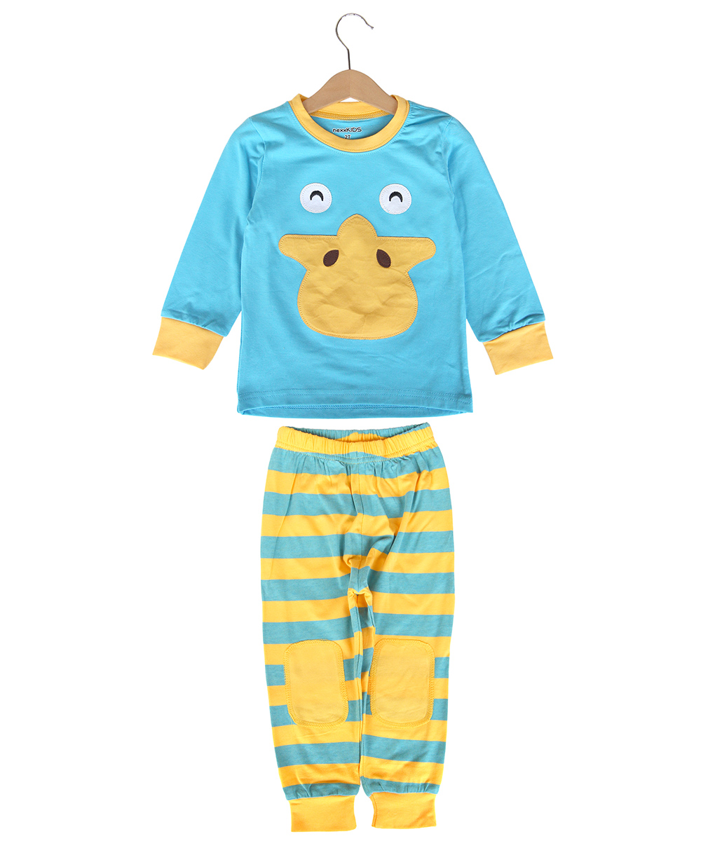 Setelan piyama untuk anak usia 2-7 tahun berwarna biru muda dengan aplikasi gambar wajah bebek, pada baju berlengan panjangnya dan celana bercorak stripes dengan patch pada bagian dengkulnya. Standard cutting.