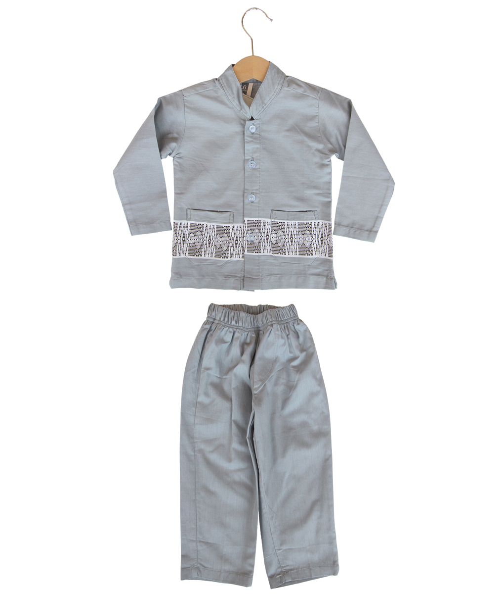 Setelan baju koko lengan panjang dan celana panjang dengan warna abu-abu, baju dilengkapi dengan dua buah kantong depan di bagian bawah, unik dengan pola pixel bagian bawah yang melintasi kantong depan, celana warna polos. Standar cutting.