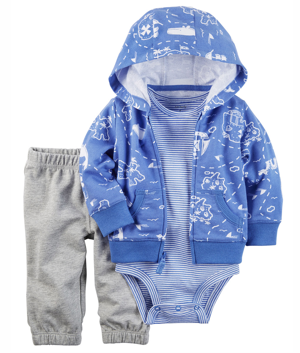 Setelan bodysuit, jaket dan celana. Bodysuit biru muda motif garis-garis, jaket biru dengan motif kapal dan celana jogger warna abu-abu. Pas dikenakan si kecil dalam beragam kegiatannya. Standar cutting.