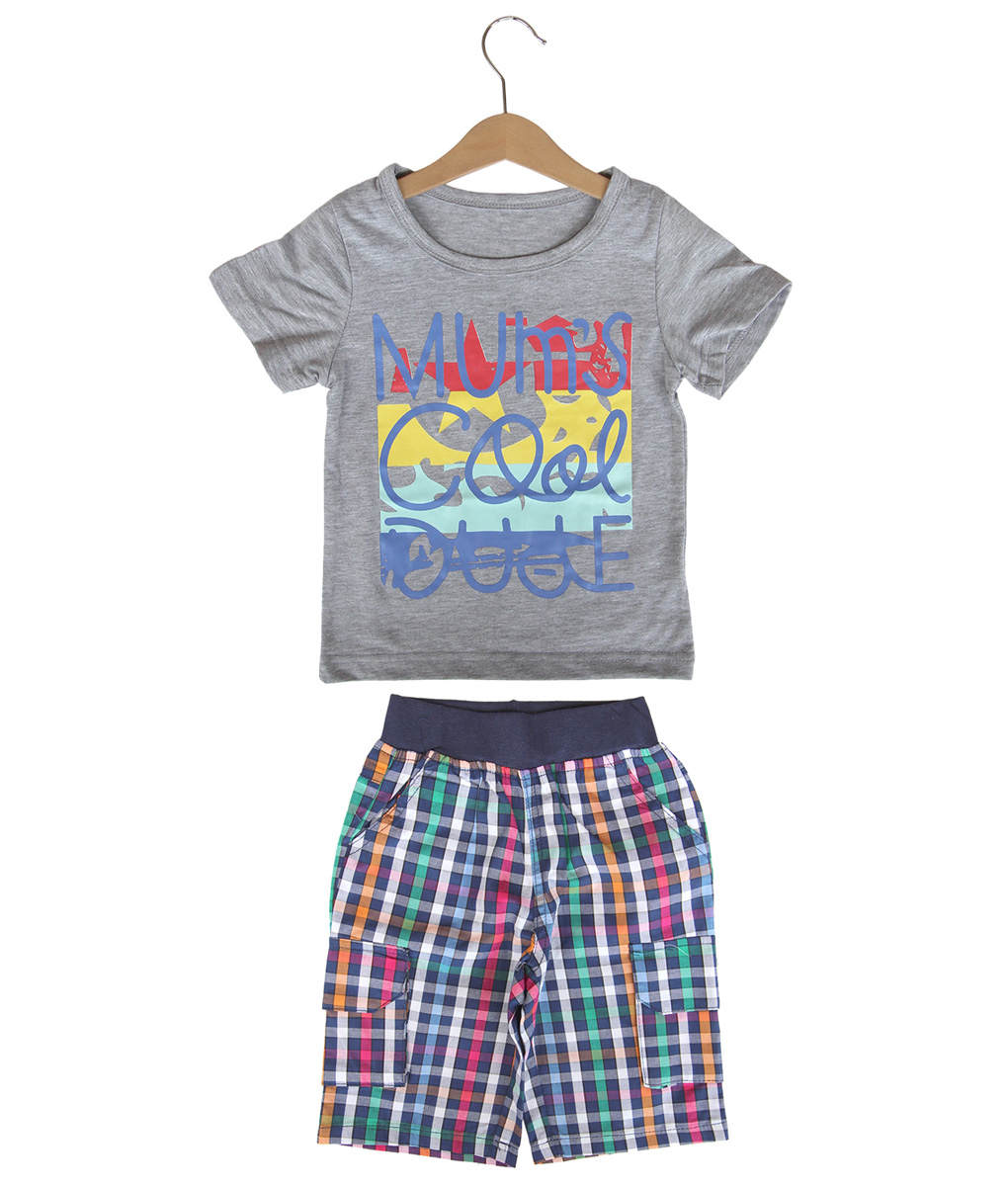 Setelan kaos dan celana pendek anak yang nyaman digunakan untuk bermain dan aktivitas lainnya, kaos warna abu-abu dengan tulisan Mom’s Cool Dude, celana motif kotak-kotak warna-warni dengan aksen kantong samping. Standar cutting.