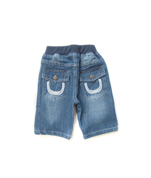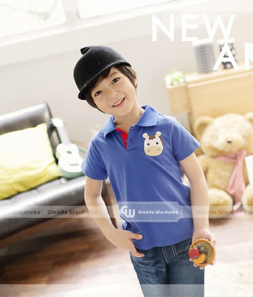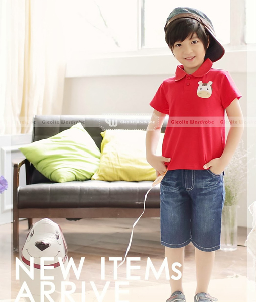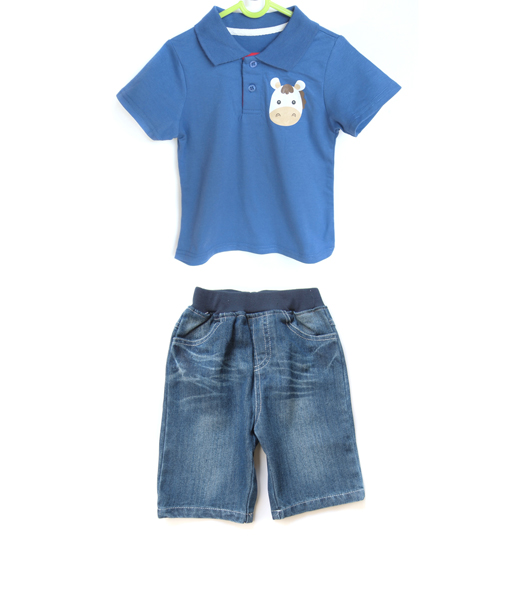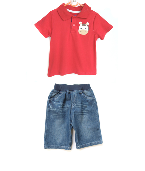 Setelan kaos kerah gambar sapi dengan pilihan warna Blue atau Red dan celana jeans pendek dengan pinggang elastis, kantong di bagian depan dan belakang, serta aplikasi jahitan pada kantong belakang. Standard cutting.