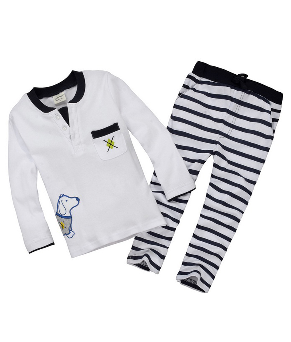 Setelan anak lengan panjang yang nyaman untuk dipakai di rumah dan tetap keren untuk dipakai beraktivitas di luar rumah, kaos warna putih gambar anjing Daschund dengan aksen kantong dada, celana motif garis-garis. Standar cutting.