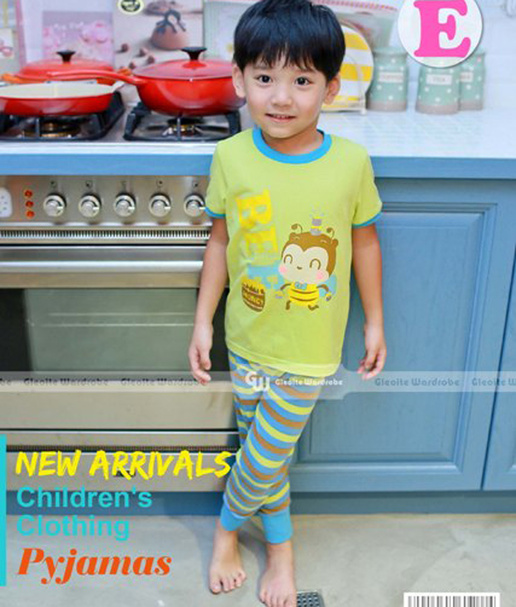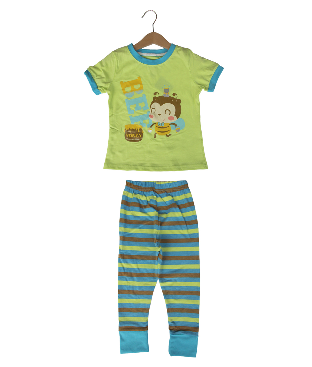 Setelan piyama anak lengan pendek celana panjang, kaos warna hijau gambar ebah dan madu, celana warna biru hijau dan coklat motif stripes dengan manset. Standar cutting.