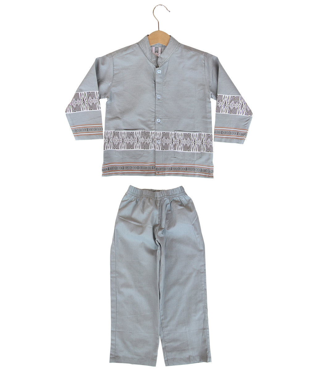Setelan baju koko lengan panjang dan celana panjang dengan warna abu-abu, baju dilengkapi dengan dua buah kantong depan di bagian bawah, unik dengan pola pixel bagian bawah yang melintasi kantong depan, aksen lining orange pada bagian bawah baju, celana warna polos. Standar cutting.