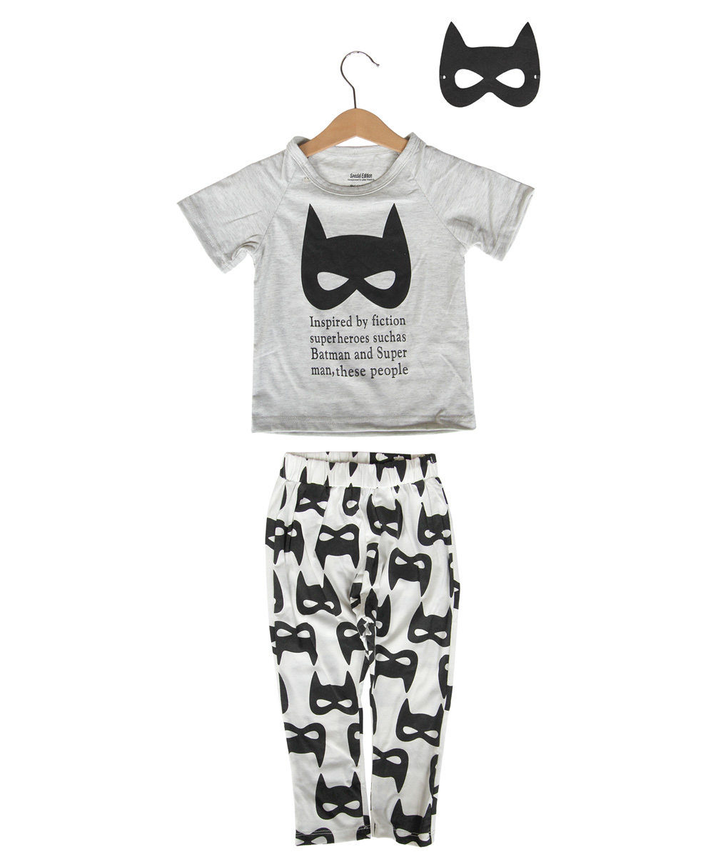 Setelan anak size 1-7 Tahun yang cocok untuk digunakan untuk beraktivitas, terdiri atas kaos dan celana dan topeng mata, kaos lengan pendek warna abu-abu muda gambar topeng mata, celana panjang warna putih motif topeng mata yang serasi.