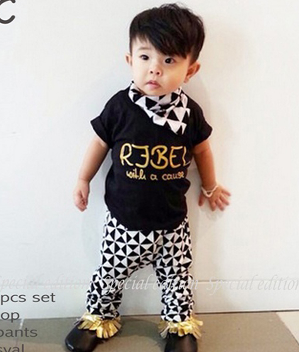 Setelan anak size 1-7 Tahun yang cocok untuk digunakan untuk beraktivitas, terdiri atas kaos dan celana panjang dan syal, kaos lengan pendek warna hitam dengan tulisan, celana kaos motif kotak-kotak segitiga hitam-putih, syal serasi dengan celana.