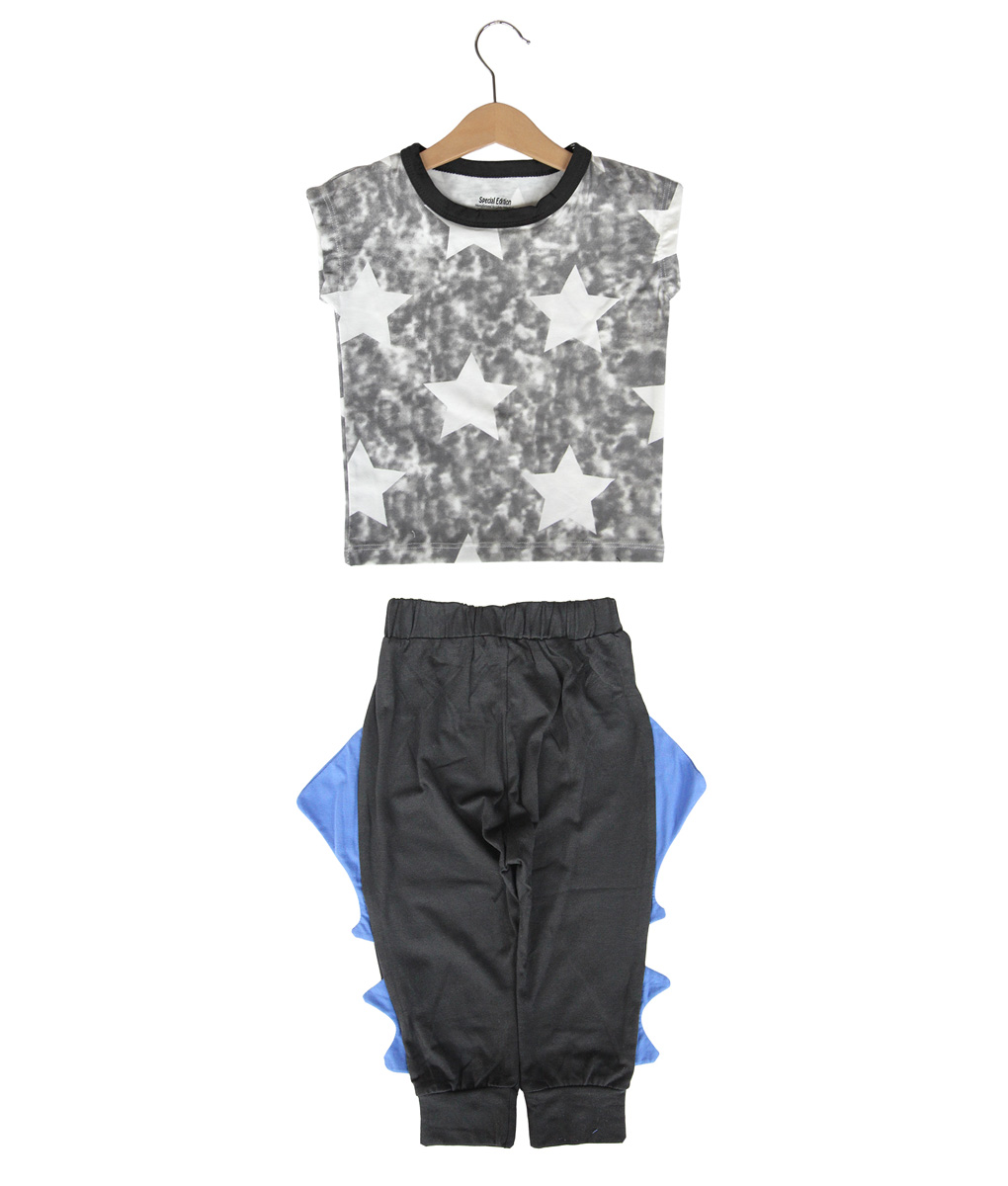 Setelan anak size 1-7 Tahun yang cocok untuk digunakan untuk beraktivitas, terdiri atas kaos dan celana, kaos lengan pendek warna abu-abu dusty motif bintang, celana panjang warna hitam dengan aplikasi di bagian samping.