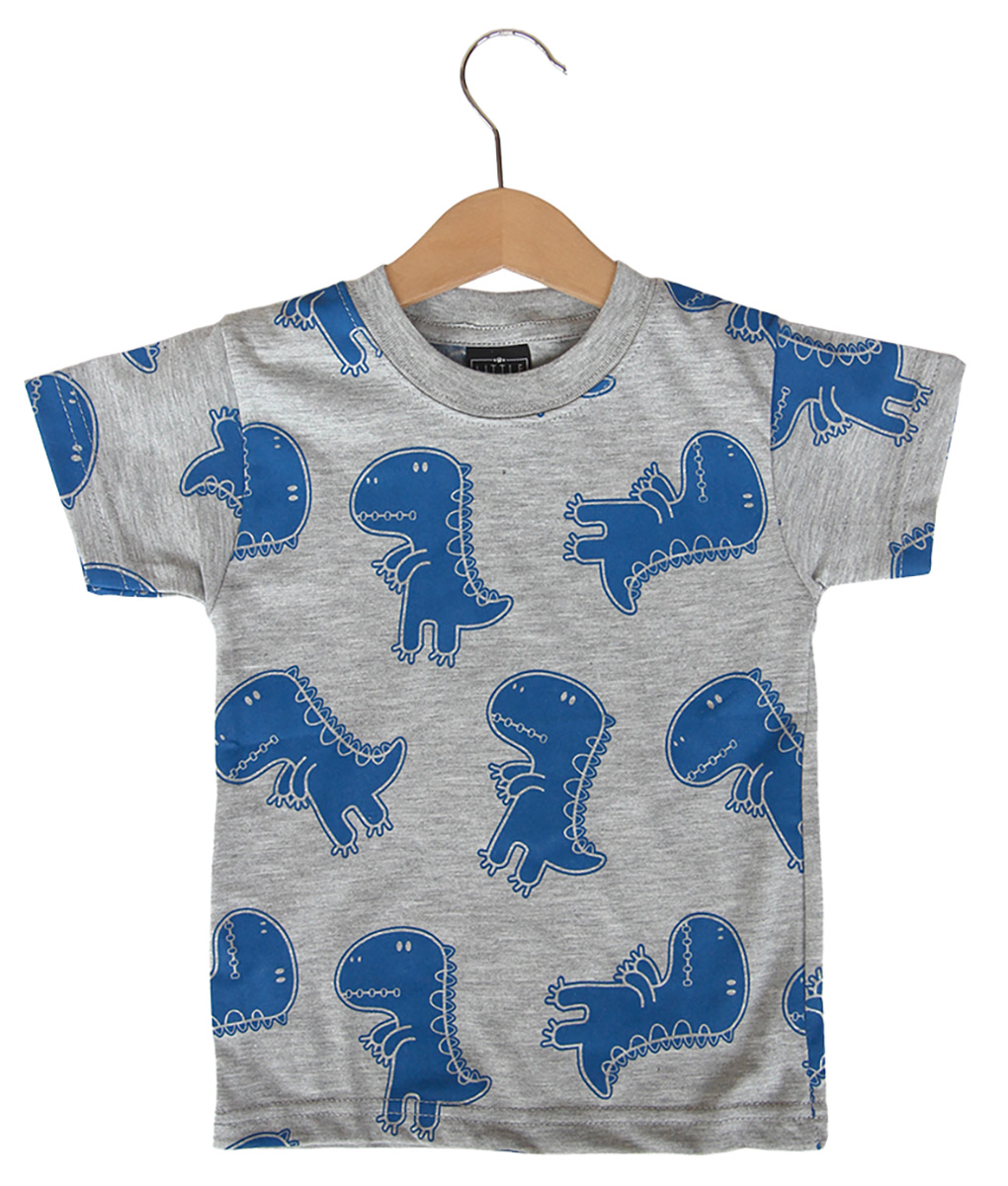 Kaus abu-abu dengan motif T-rex warna biru, bahannya nyaman dikenakan si kecil saat aktif bermain. Standard Cutting.