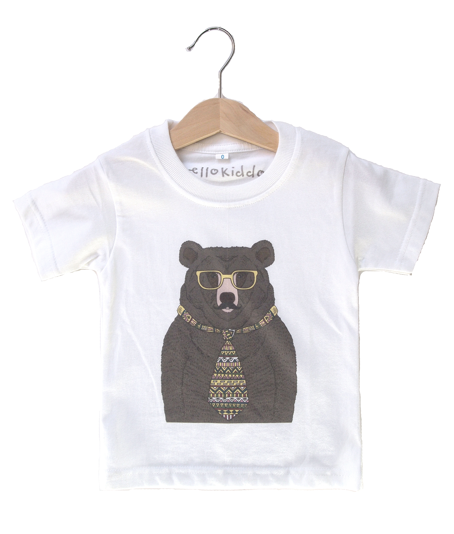 Kaos anak dengan bahan cotton yang nyaman untuk bermain di rumah dan tetap stylish untuk bepergian, warna putih dengan gambar beruang yang memakai kacamata dan dasi. Standard cutting.