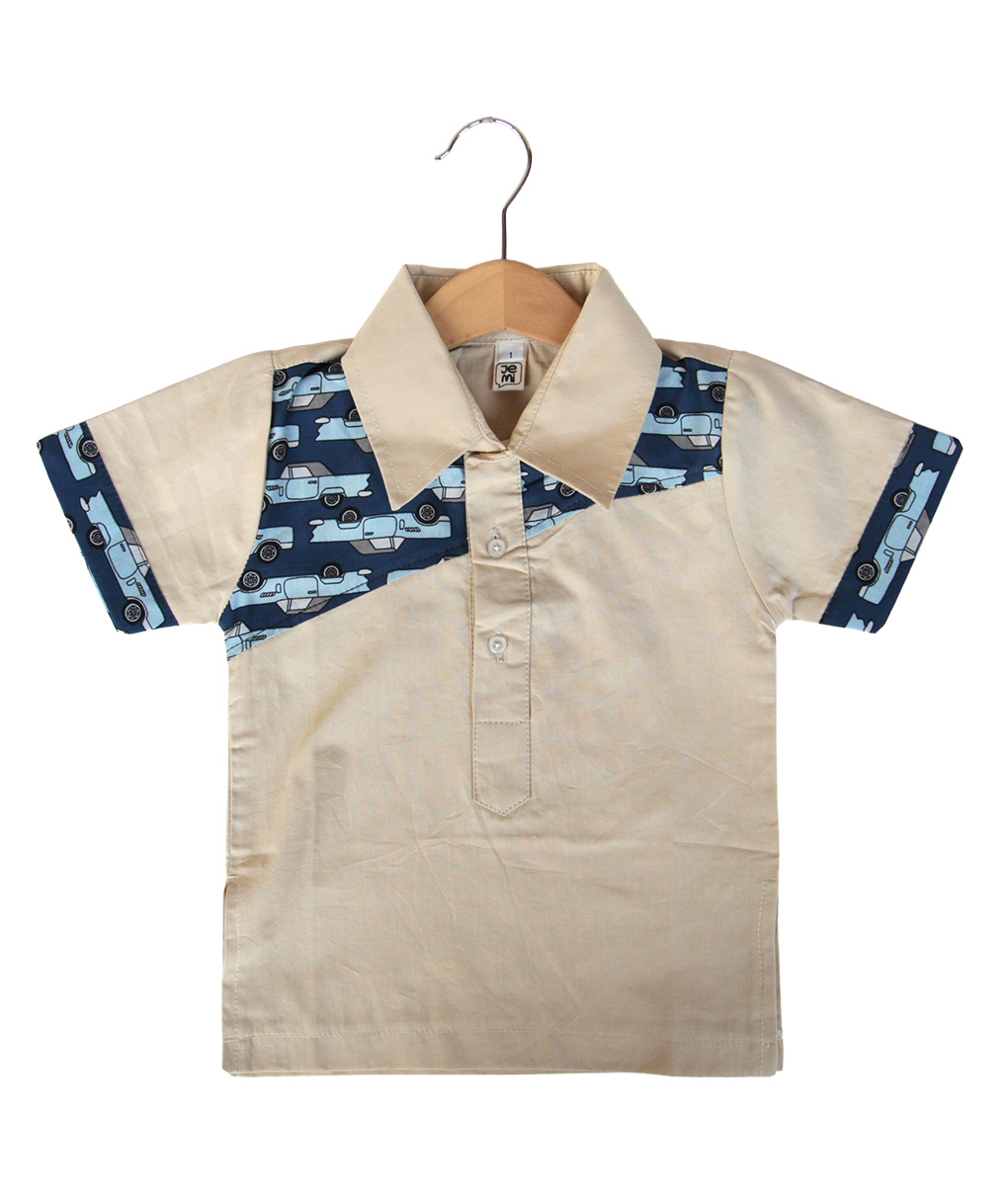 Kemeja katun krem untuk anak usia 1-7 tahun, dengan aksen motif bergambar mobil pada bagian dada dan lining lengan, dengan kancing depan pada bagian dada untuk mempermudah pemakaian. Cocok dikenakan dalam acara-acara semi formal. Standard cutting.