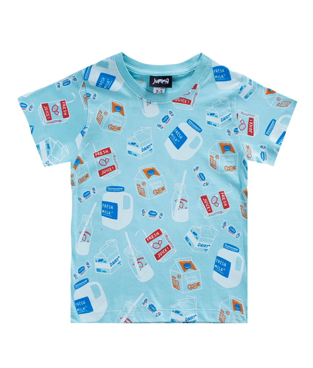 Kaos kasual warna biru dengan full printed motif aneka minuman sehat. Mulai dari jus, susu, hingga minuman lainnya ada disini. Bahan yang nyaman mudah menyerap keringat si kecil yang aktif dan dinamis.
