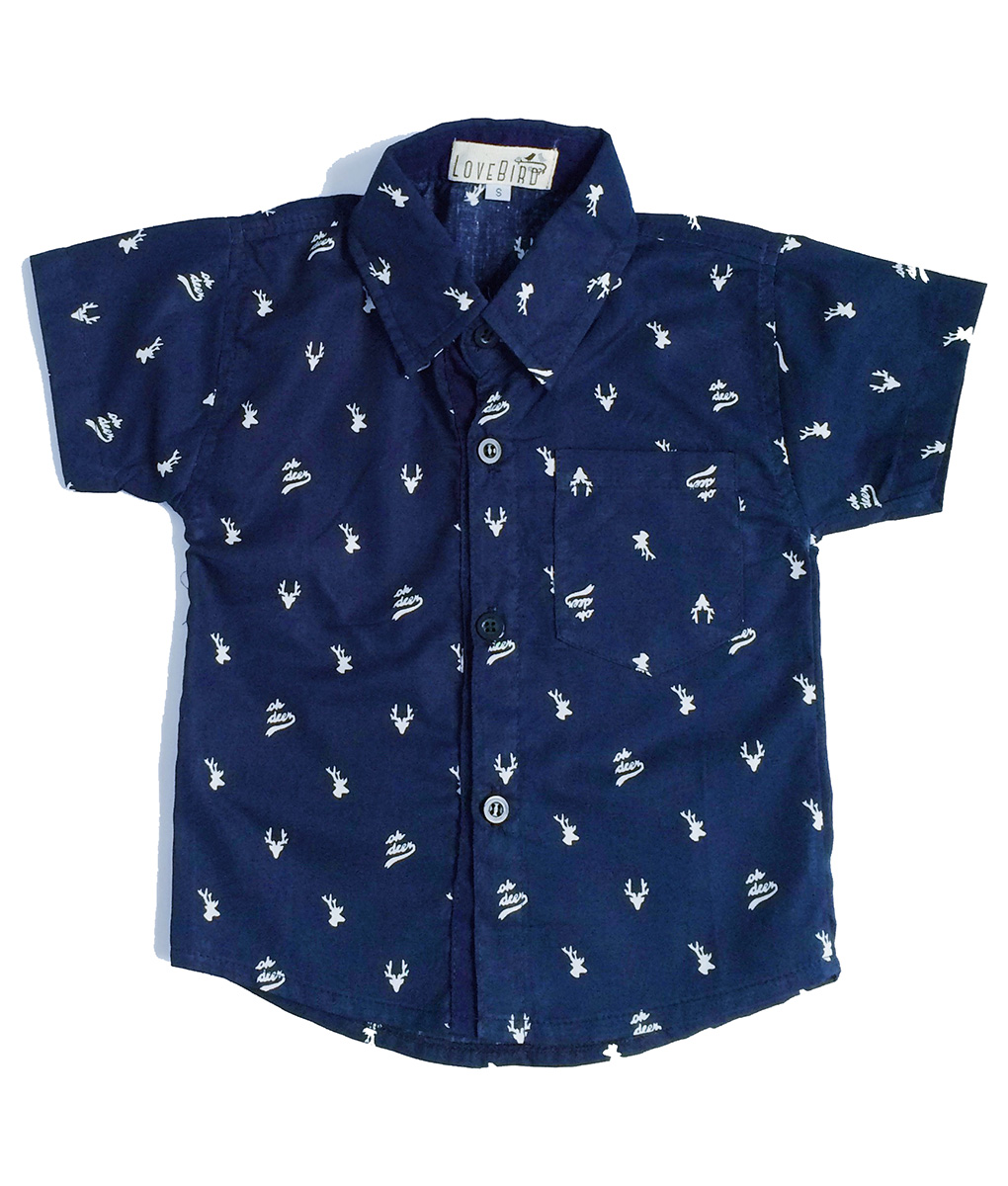 Kemeja navy untuk bayi usia 6 bulan – 4 tahun, berbahan katun dengan motif kepala rusa kecil. Cocok dikenakan si kecil dalam acara-acara semi formal. Standard cutting.