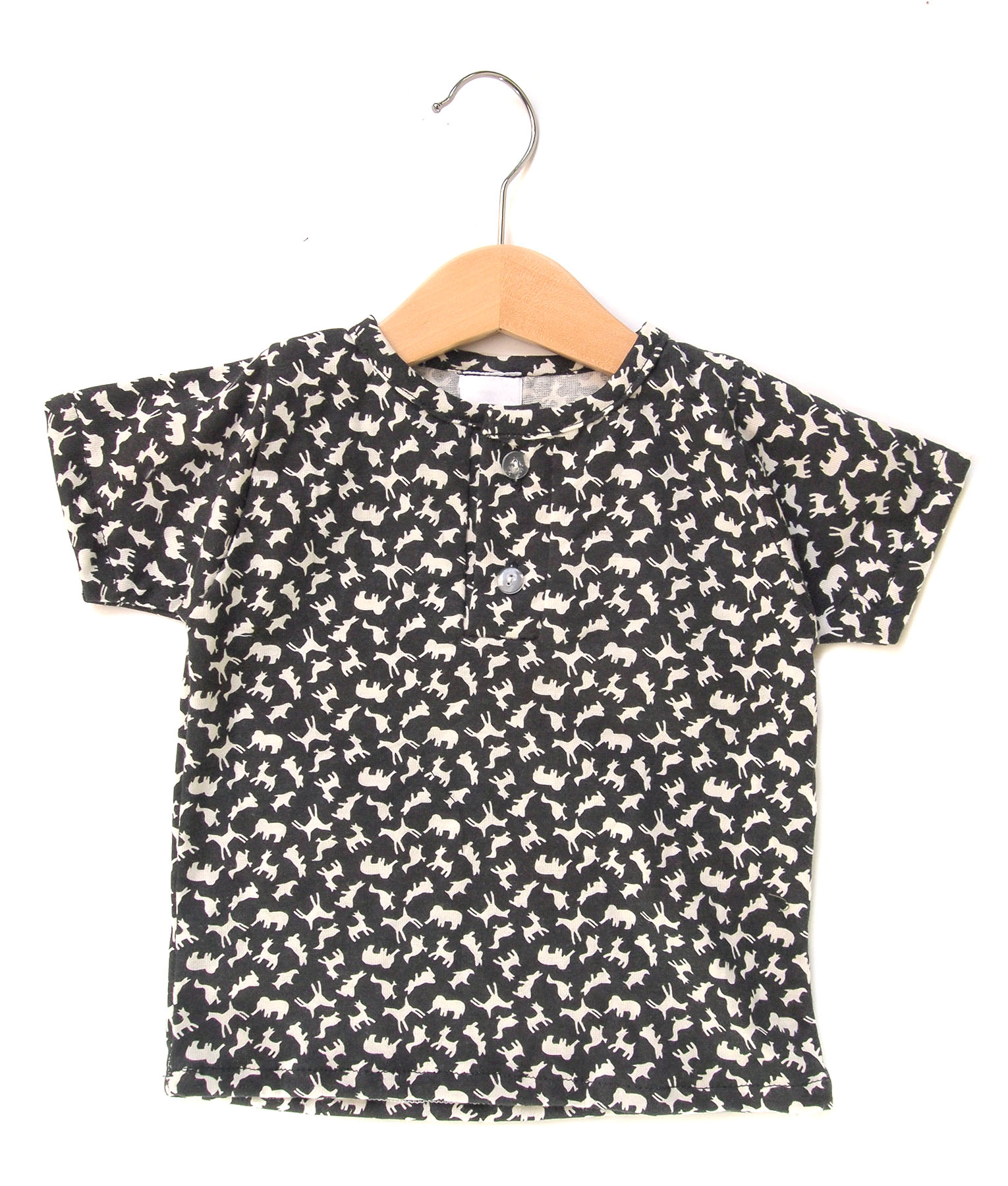 Kaos anak lengan pendek warna hitam motif siluet putih binatang dengan dua kancing depan dan aksen lining leher. Standard cutting.