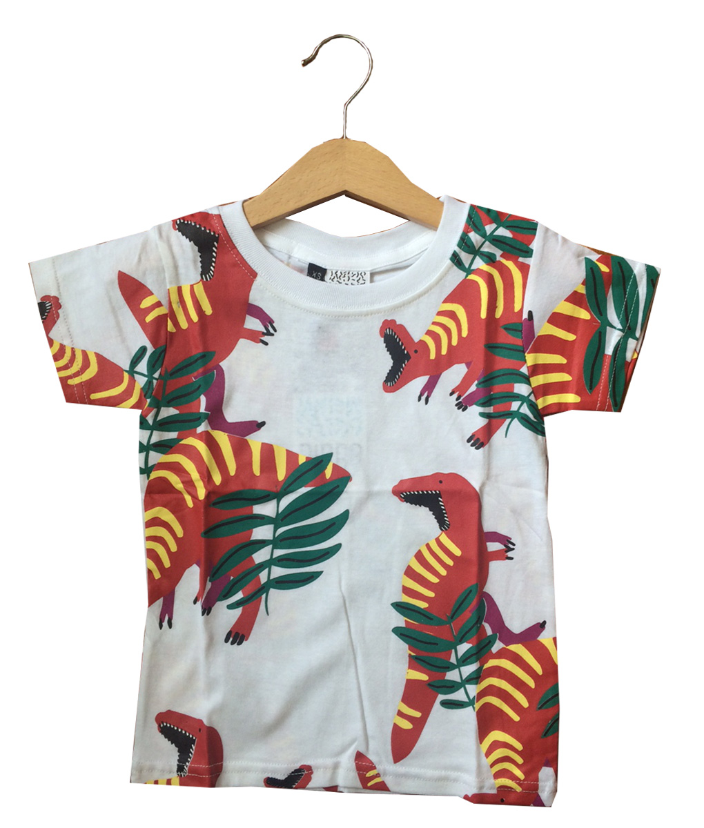 Kaos kasual warna putih dengan motif dinosaurus pink. Cocok dipadankan dengan celana jeans dan sneakers untuk penampilan kasual si kecil. Standard cutting.