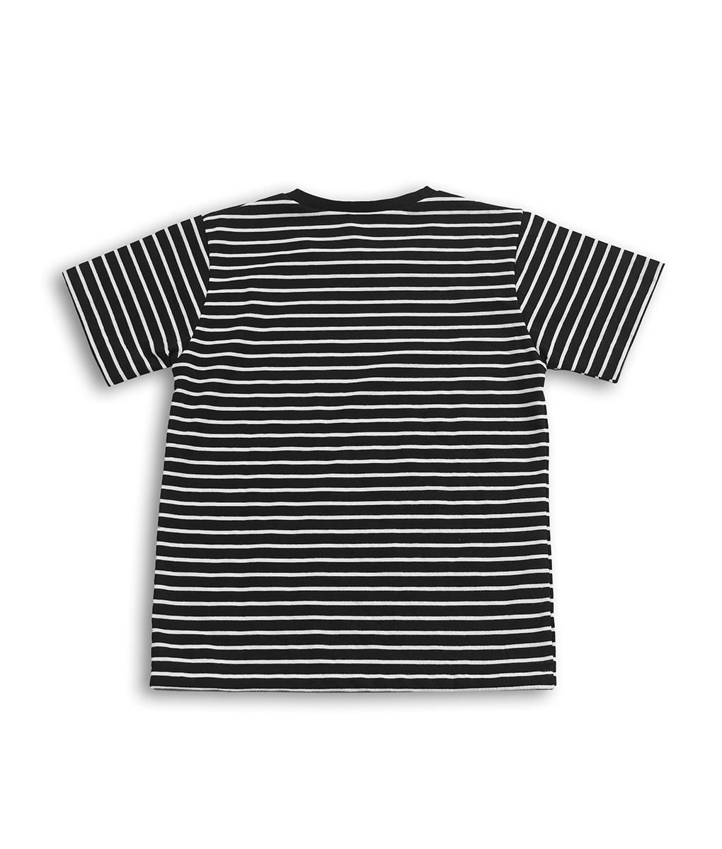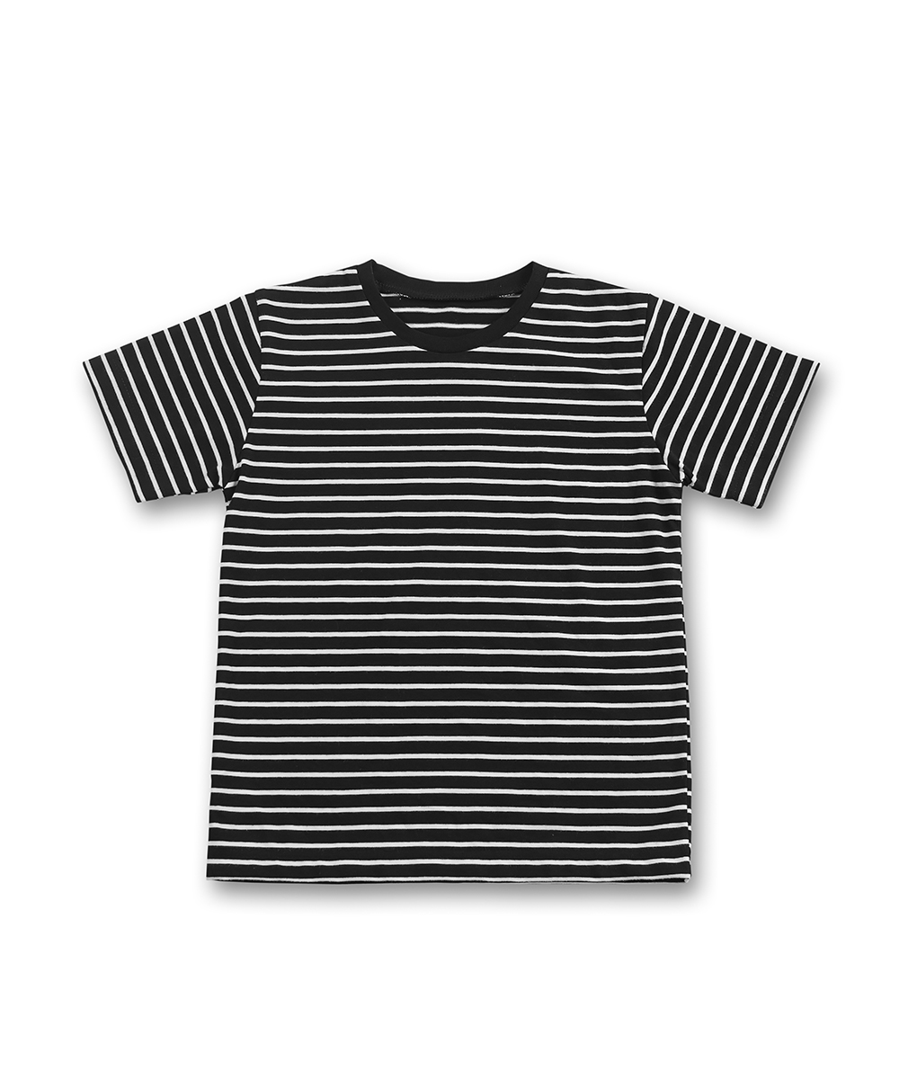 Kaos lengan pendek berwarna hitam bermotif garis-garis putih. Terdapat list berwarna hitam pada bagian kerahnya. Dapat dikenakan untuk anak perempuan dan laki-laki. Standar cutting.