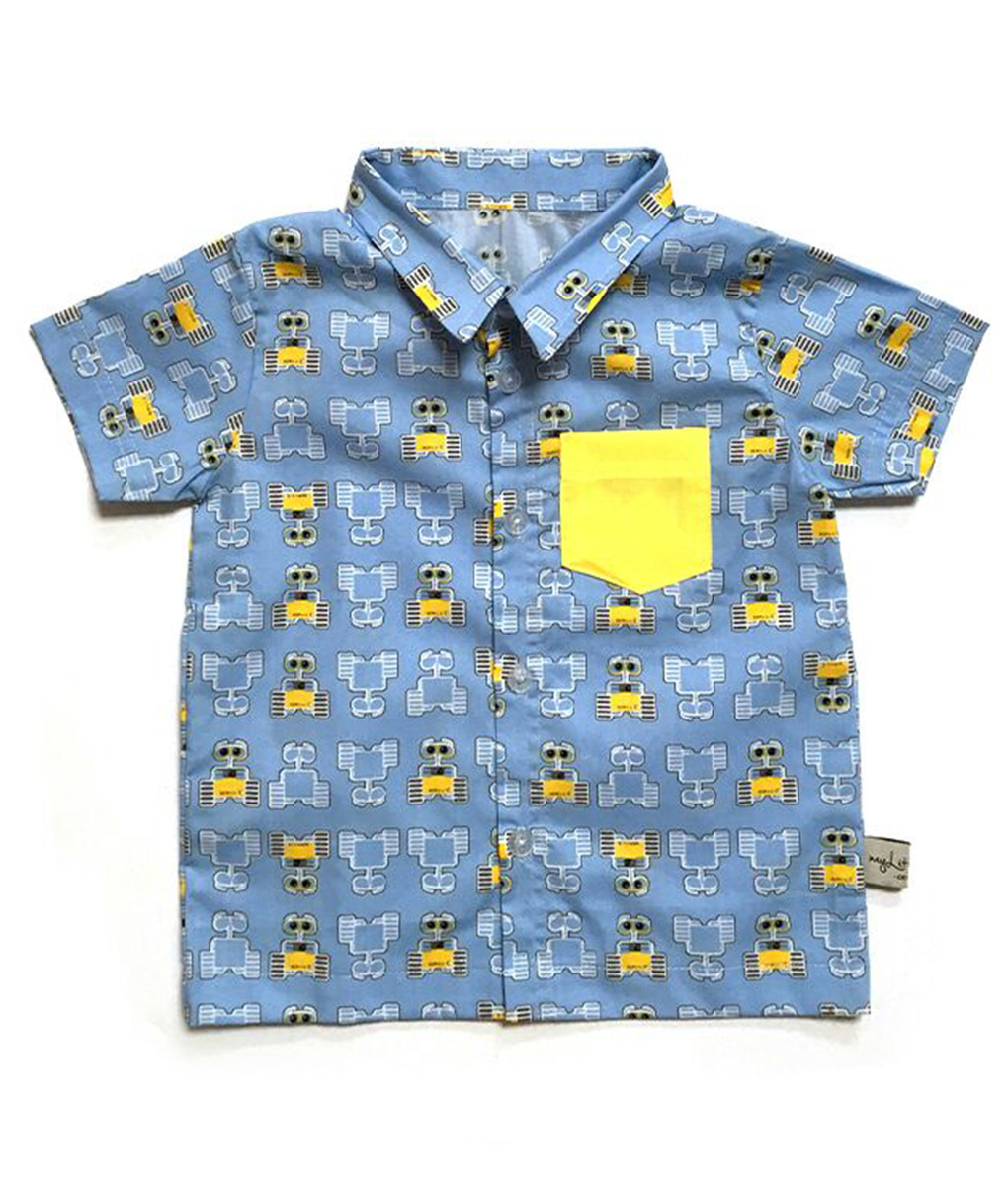 Kemeja bayi dan anak usia 6 bulan – 4 tahun, warna biru muda motif karakter wallE. Dengan aksen kantong berwarna kuning. Bahannya nyaman dikenakan si kecil, sehingga membuatnya tetap aktif. Standard cutting.