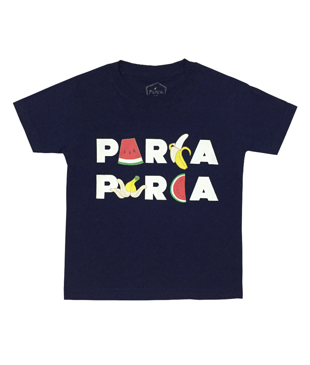 Kaos anak dyang nyaman dan keren untuk dipakai beraktivitas, kaos warna biru tua gambar buah yang membentuk tulisan. Standar cutting.