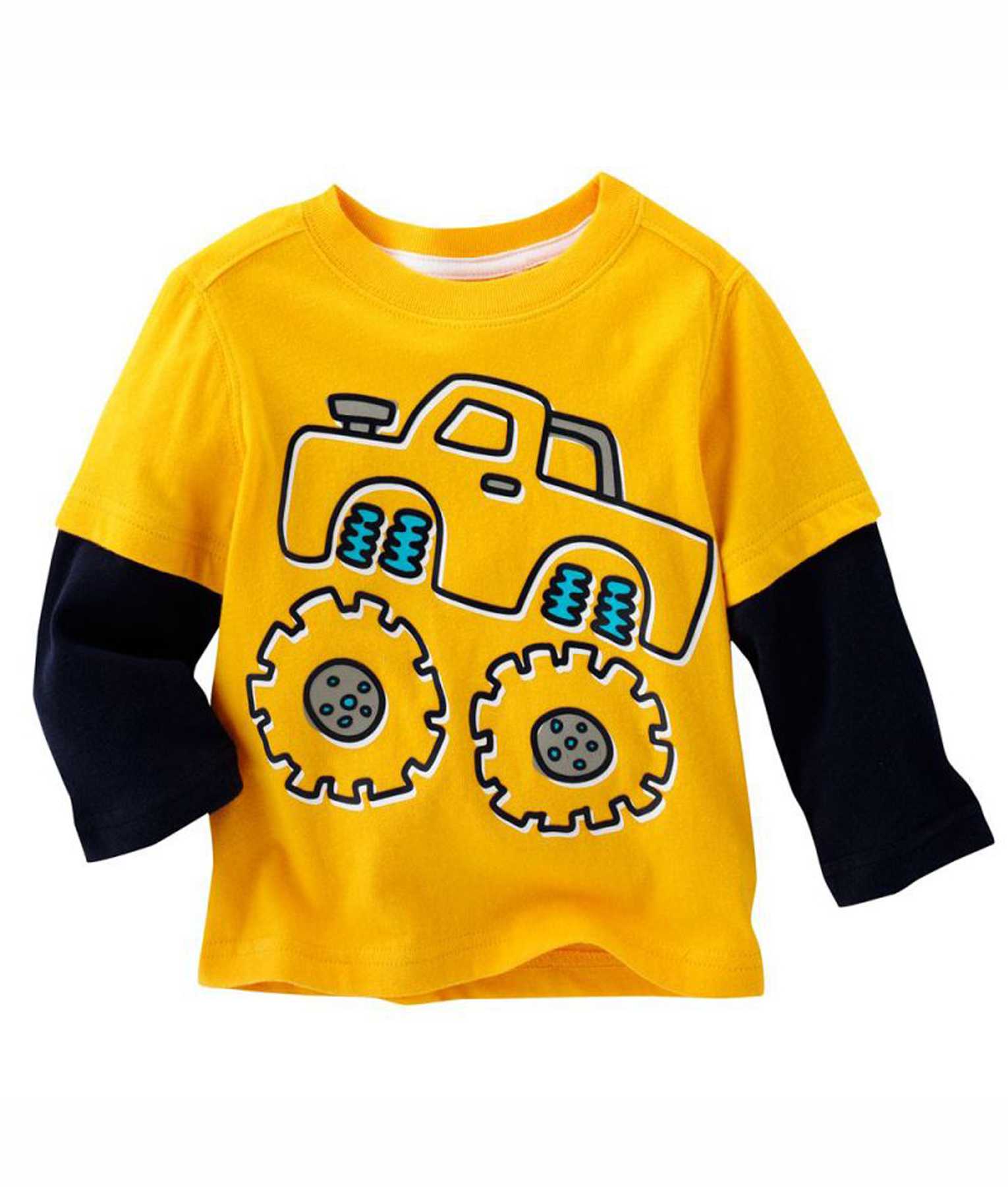 Kaos anak lengan panjang bahan cotton yang nyaman untuk di rumah dan tetap keren untuk bepergian, aksen lengan sambung, warna kuning dengan gambar garis truk beroda besar. Standard cutting.