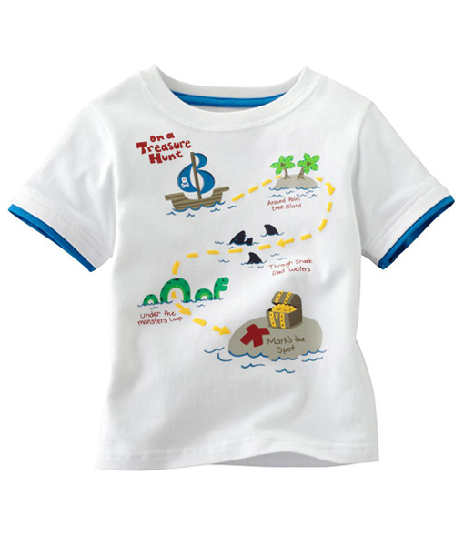Kaos anak dengan bahan cotton yang nyaman untuk bermain di rumah dan tetap stylish untuk bepergian, warna putih garis biru pada lengan dengan ilustrasi peta harta karun lengkap dengan kapal bajak laut, naga, dan pulau tempat harta karun berada. Standard cutting.