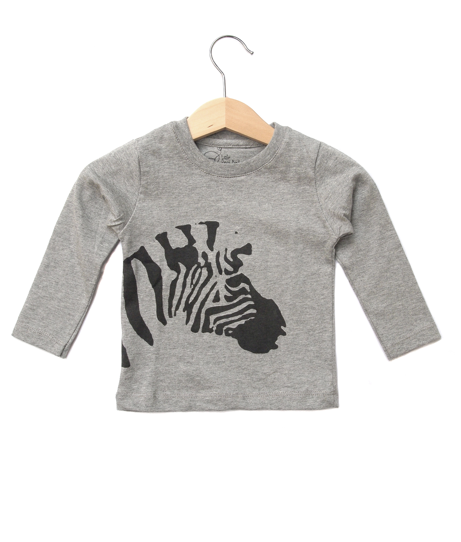 Kaos lengan panjang bayi dari bahan yang nyaman, untuk dipakai di rumah maupun untuk aktivitas jalan-jalan. Warna abu-abu dengan gambar zebra. Standar cutting.