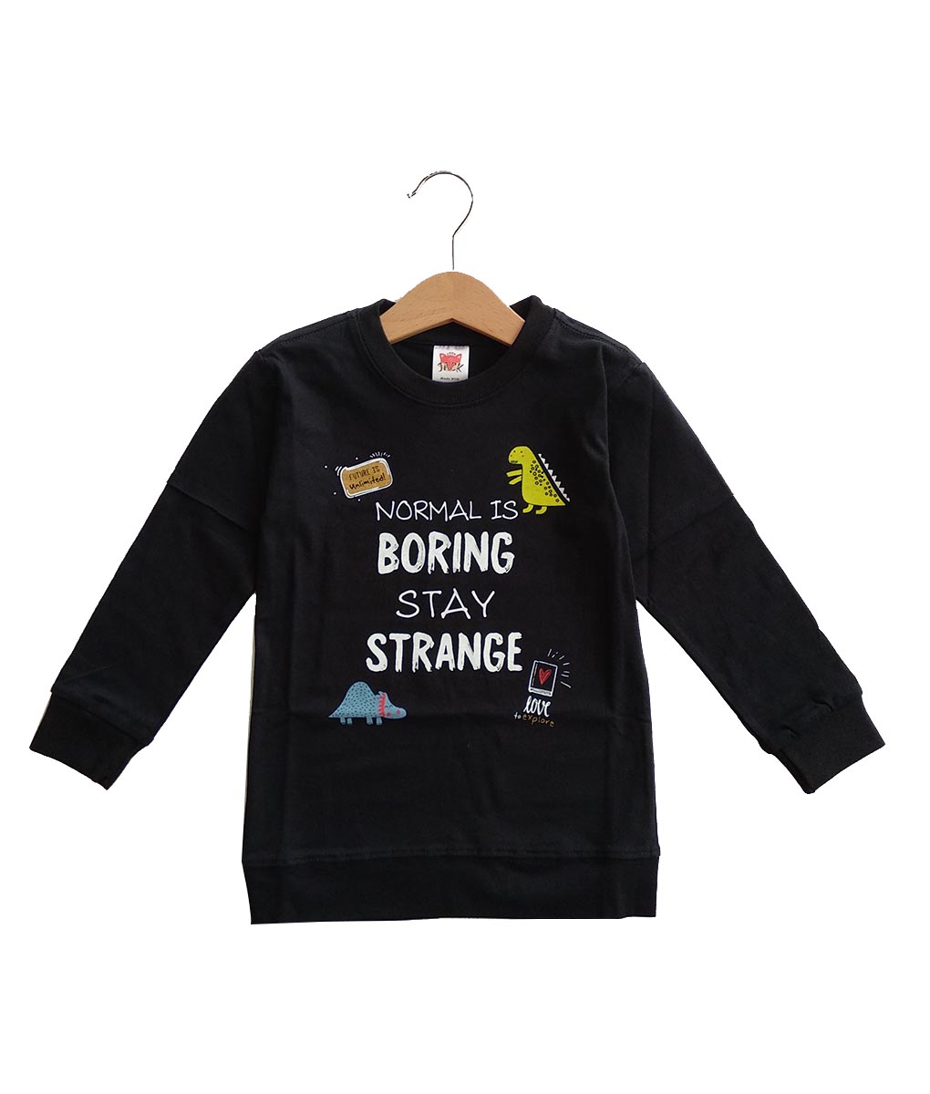 Kaos lengan panjang untuk anak usia 9 bulan sampai 5 tahun. Berwarna hitam dengan gambar dinosaurus mini yang lucu. Terdapat tulisan Normal Is ‘Boring Stay Strange’ membuat kaos ini makin cool dan stylish jika dikenakan si kecil. Terbuat dari 100% cotton yang berkualitas menyesuaikan kebutuhan kenyamaan sang buah hati.