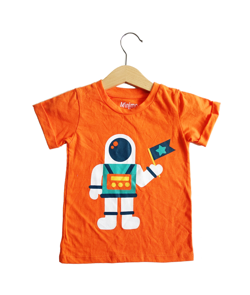 Kaos kasual unisex, untuk anak usia 2-5 tahun. Warna orange dengan gambar astronot yang keren. Pas dikenakan untuk kegiatan harian si kecil. Standar cutting.