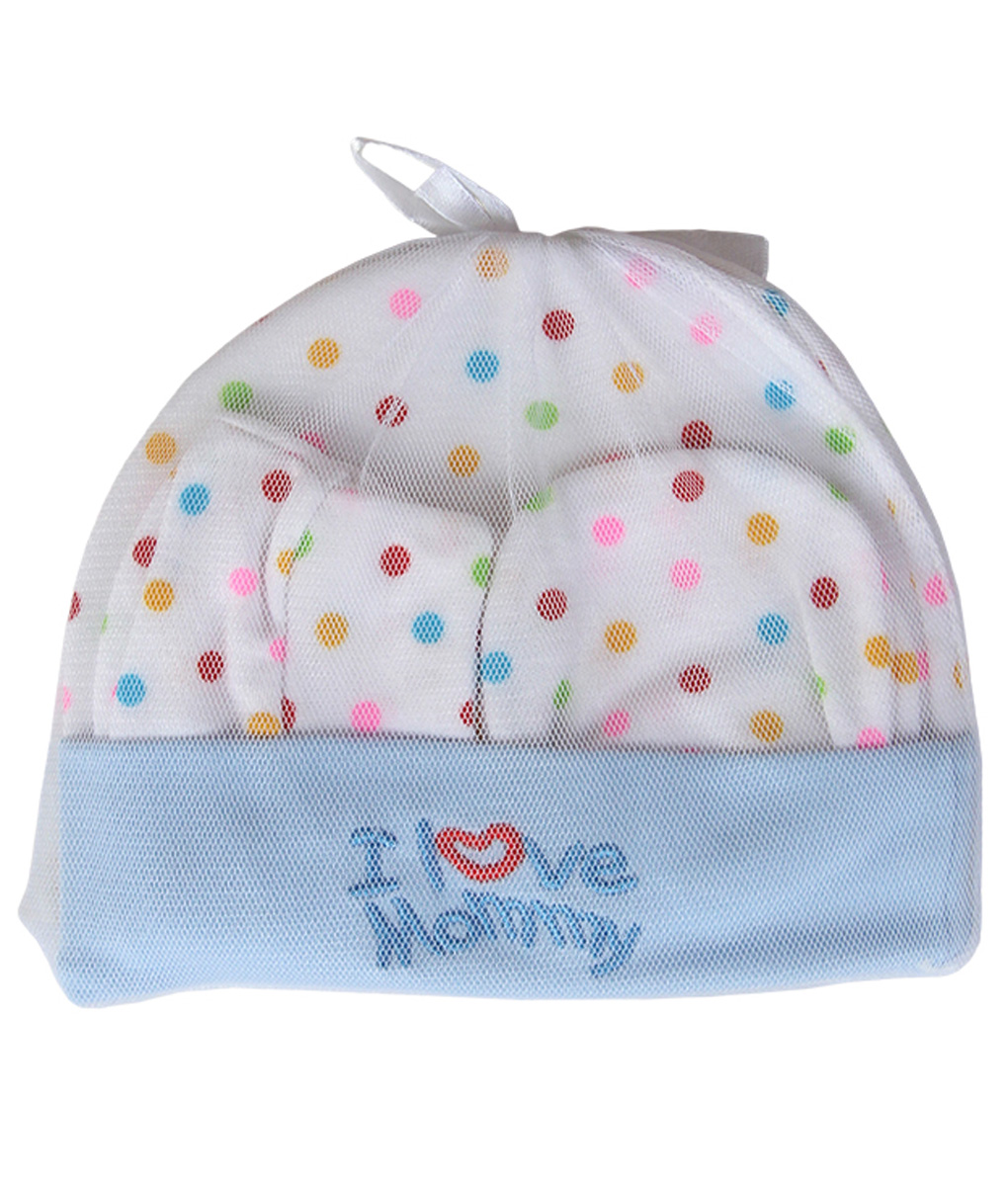 Topi, sarung tangan, dan kaos kaki booties bayi newborn yang dikemas menarik, warna putih motif polkadot dengan lining topi warna biru.