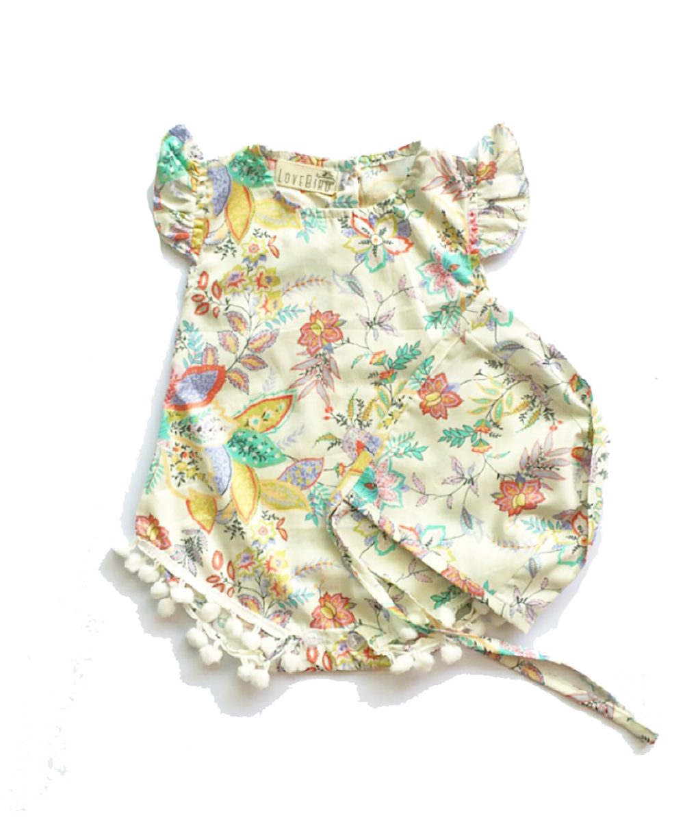 Romper bayi usia 0-24 bulan motif bunga warna-warni, dengan aplikasi pompom pada bagian bawah, lengan cutout dan dilengkapi bonnet yang membuat si kecil makin menggemaskan. Standard cutting.