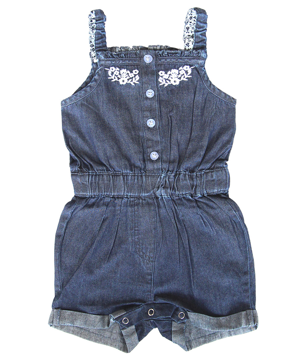 Bodysuit lengan panjang, berbahan denim warna biru dengan aksen motif kotak-kotak pada bow tie, pundak dan lining pergelangan tangan. Dengan kantong kecil dan kancing jepret pada bagian bawah sehingga mudah dikenakan oleh si kecil. Standard cutting.