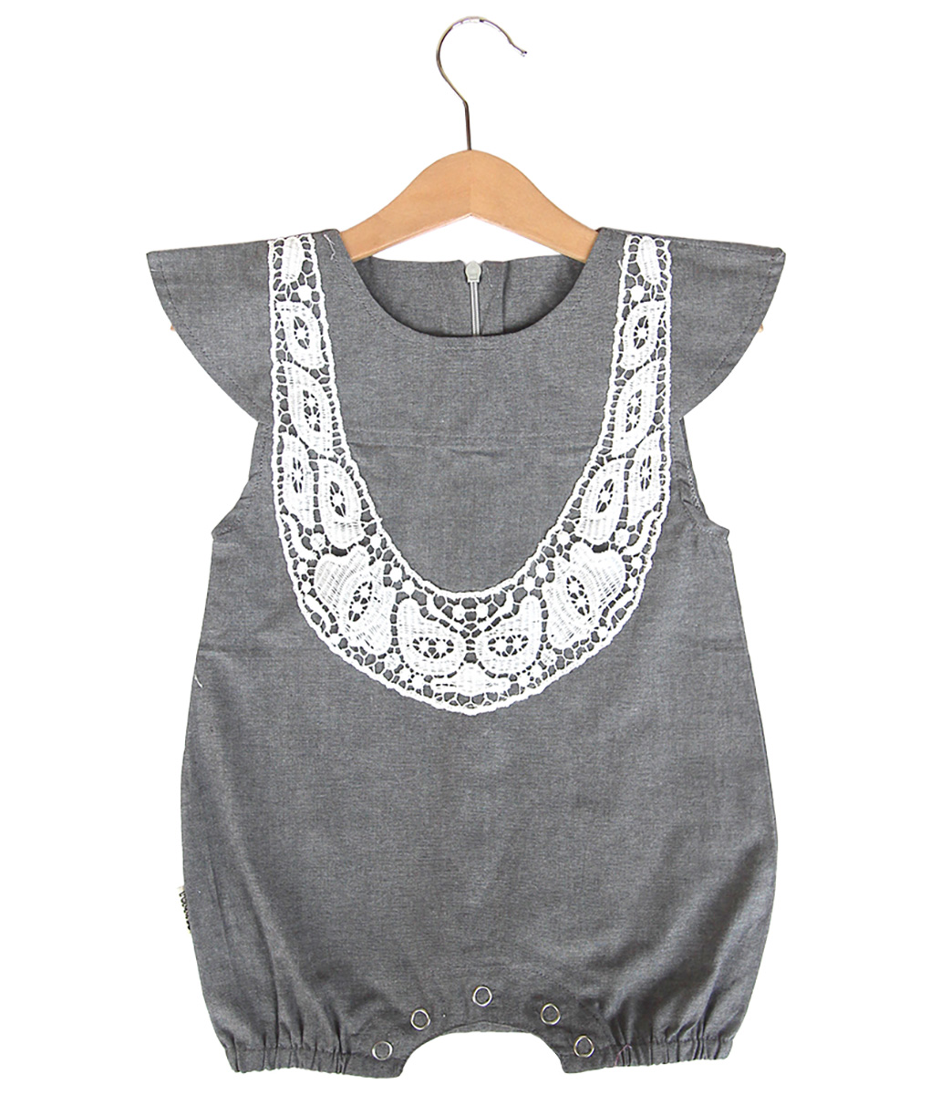 Romper bayi 0-2 tahun dengan pilihan warna grey. Berbahan katun yang nyaman dikulit bayi, dengan aksen aplikasi renda putih pada bagian lehernya dan berlengan cut out. Standard cutting.
