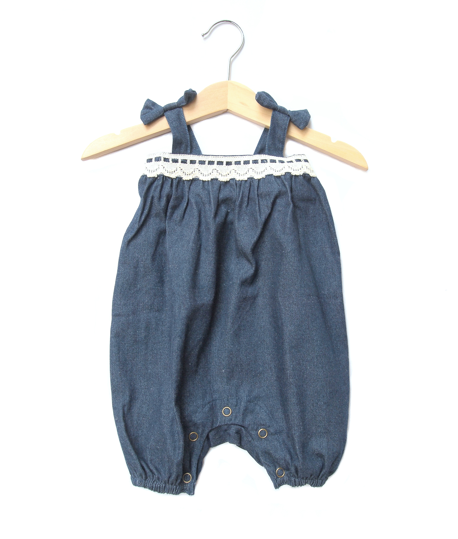 Overall romper bahan denim, hiasan pita pada tali bahu dan renda pada bagian dada, potongan bloomers yang menggemaskan untuk bayi. Standar cutting.