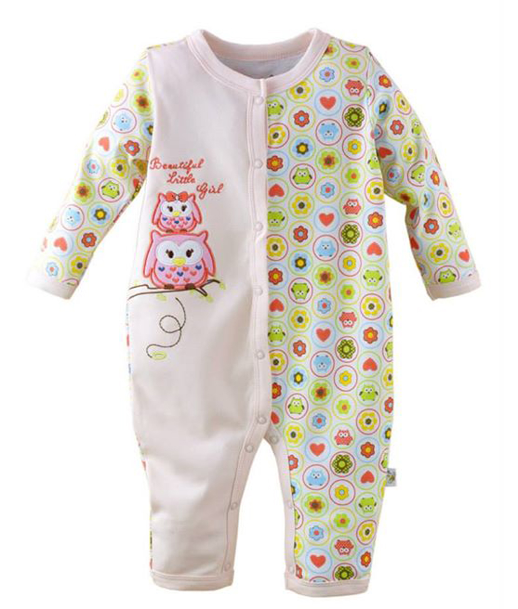Jumper bayi kaki terbuka yang nyaman untuk digunakan tidur ataupun beraktivitas lainnya, motif lingkaran gambar bunga, hati dan burung hantu. Standar cutting.