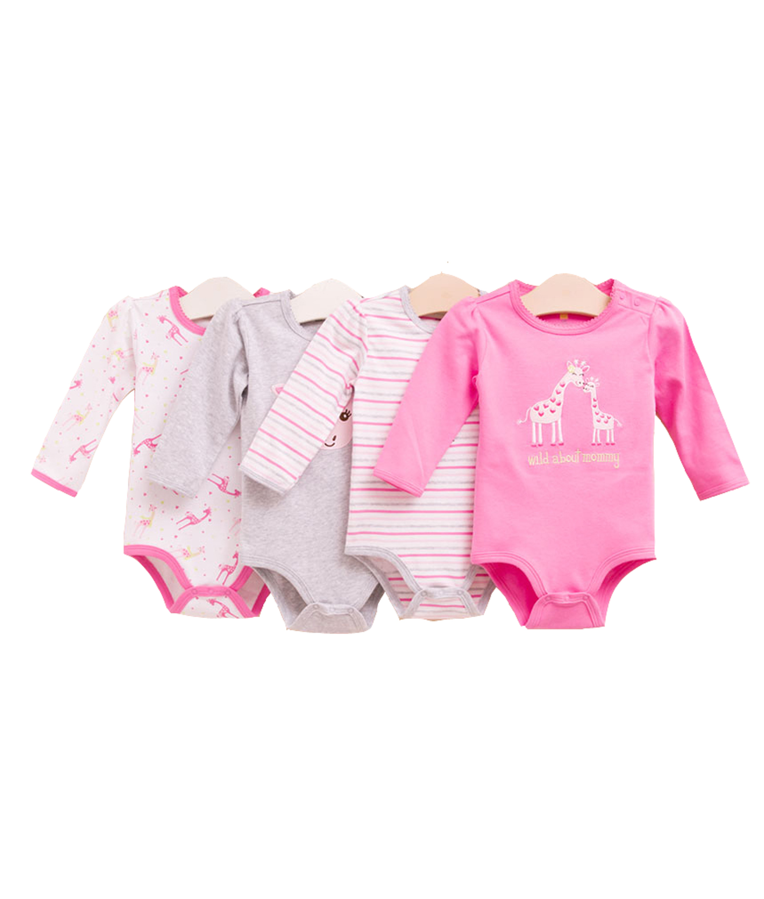 Bodysuit lengan panjang isi 4 lembut untuk bayi yang dikemas dalam kotak cantik, cocok untuk dipakai sendiri ataupun kado. Terdisi dari 4 buah bodysuit dengan kombinasi warna pink dan abu-abu, dalam variasi desain jerapah dan stripes, disertai kancing pada bagian leher dan pada bagian bawah untuk mempermudah pemakaian, Standard cutting.