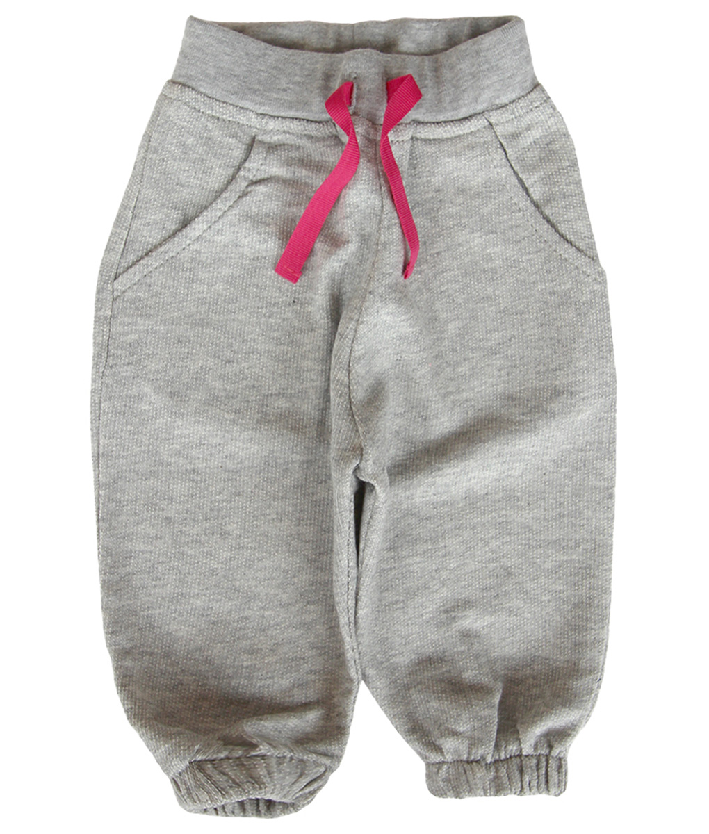 Jogger pant size bayi dengan pilihan warna-warna yang netral, warna abu-abu, disertai aksen tali pinggang warna pink, dan kantong depan, manset kerut pada bagian bawah celana.