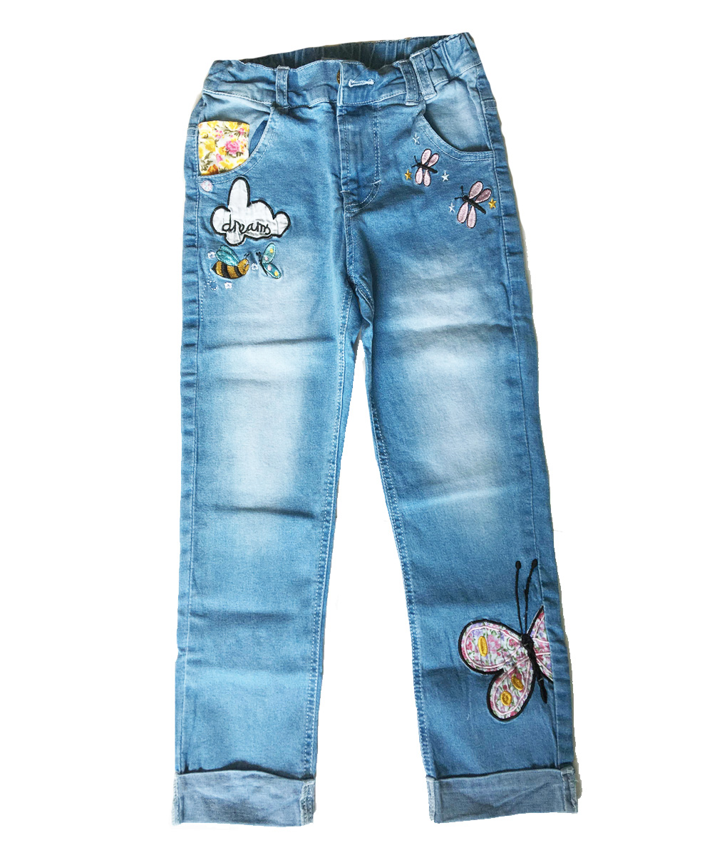 Celana jeans anak usia 1-6 tahun, dengan aplikasi bordir kupu-kupu pada bagian bawah kaki dan lebah pada sudut kantong, serta aksen bagian bawah celana yang digulung. Standard cutting.