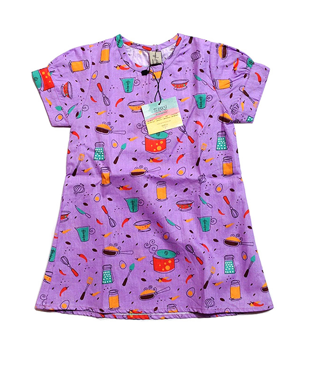 Dress kasual untuk bayi 6 bulan – anak 3 tahun. Dengan motif peralatan masak warna ungu. Bahannya yang nyaman cocok dikenakan untuk si kecil yang aktif. Standard cutting.